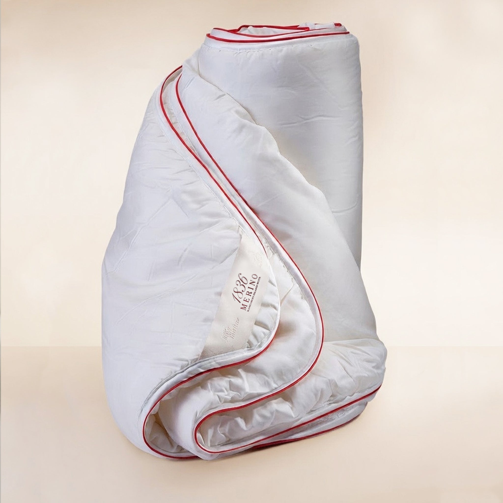 The outer superfine Tencel cover of the 1836 Merino quilt is lightly dyed a beautiful “champagne” colour and complimented with matching three piece satin royal red binding trim. A touch of luxury that is unique to all of our quilt ranges.