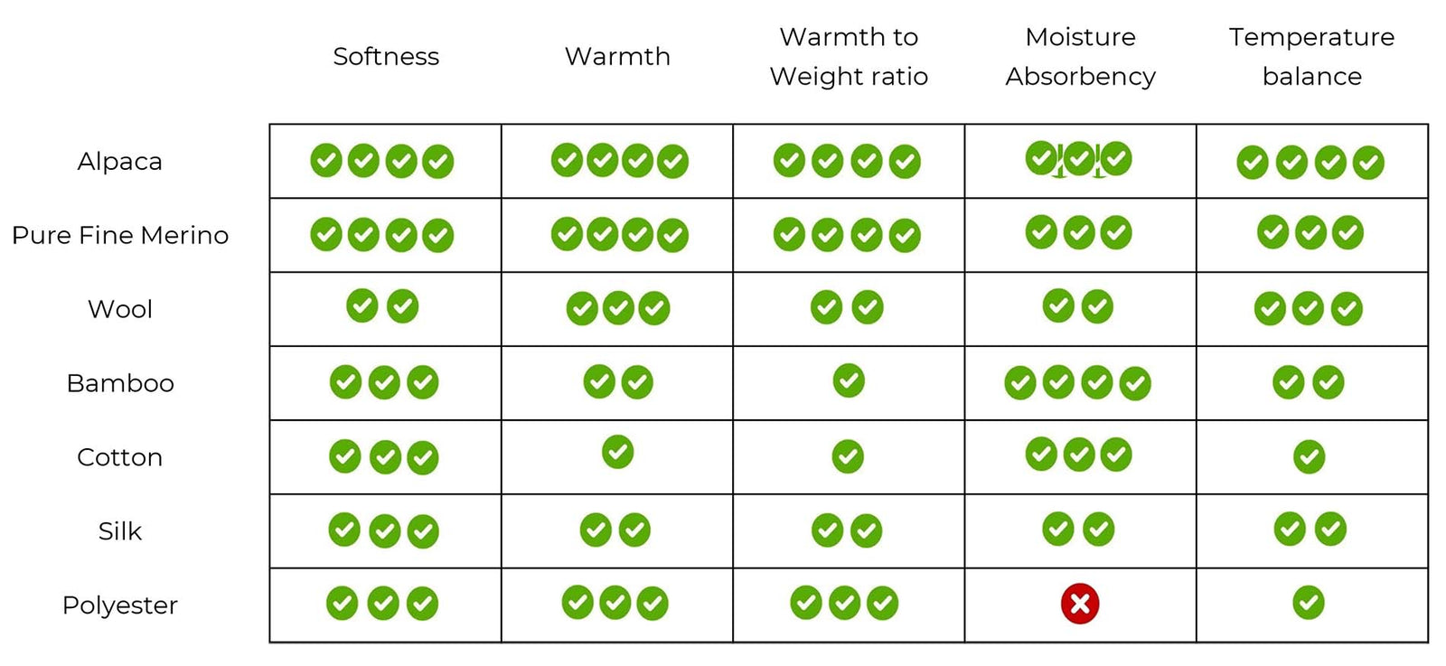 When choosing a quilt, warmth isn’t just about weight — it’s about how effectively a fibre insulates while remaining light and breathable. Natural fibres like alpaca and pure fine merino wool excel in delivering exceptional warmth without the heavy, bulky feeling of traditional quilts.