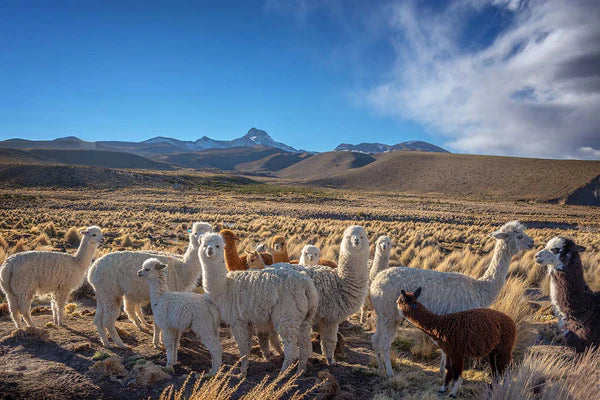 The alpaca and its relatives, the llama, vicuna and guanaco are part of the camelid family and have for thousands of years been important to the people of the ancient South American Andean civilizations. They played a vital role in the daily life of the Andean people by providing fleece and wool for clothing and blankets, but also for their meat.